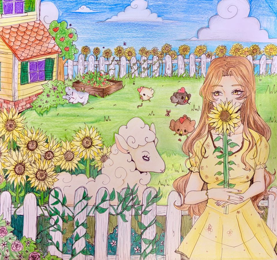 Here’s something I drew in about May last year. A coworker gave me a weird, square sketchbook. This drawing is a little rough, but it’s so cozy… I just used regular old Crayola colored pencils and a pen.