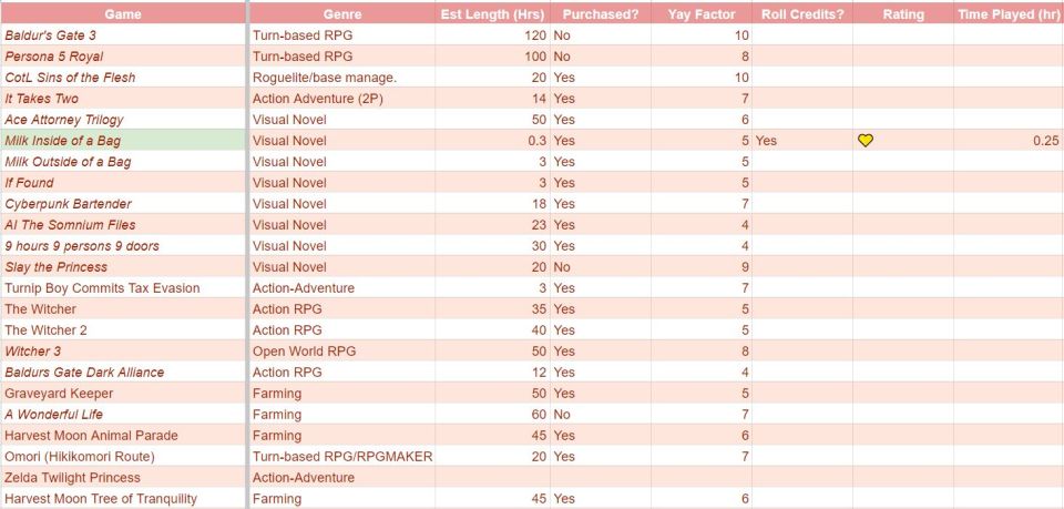 On that note, I made a backlog inspired by this video. I simplified Daryl’s spreadsheet, but the spirit of it is still there. There are more games I want to play, of course, but I looked in my games library for titles that I’ve always wanted to try (or finish) but never got around to. I will probably add more as I go. I also added games that I’ve been excited about but don’t have yet. We love Steam seasonal sales!